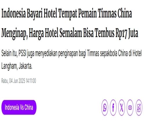 报道称,印尼足协安排的住宿地点是雅加达的朗廷酒店,这家酒店位于中央商务区,距离比赛场馆仅有10分钟车程。此外这家酒店安保措施极其严密。